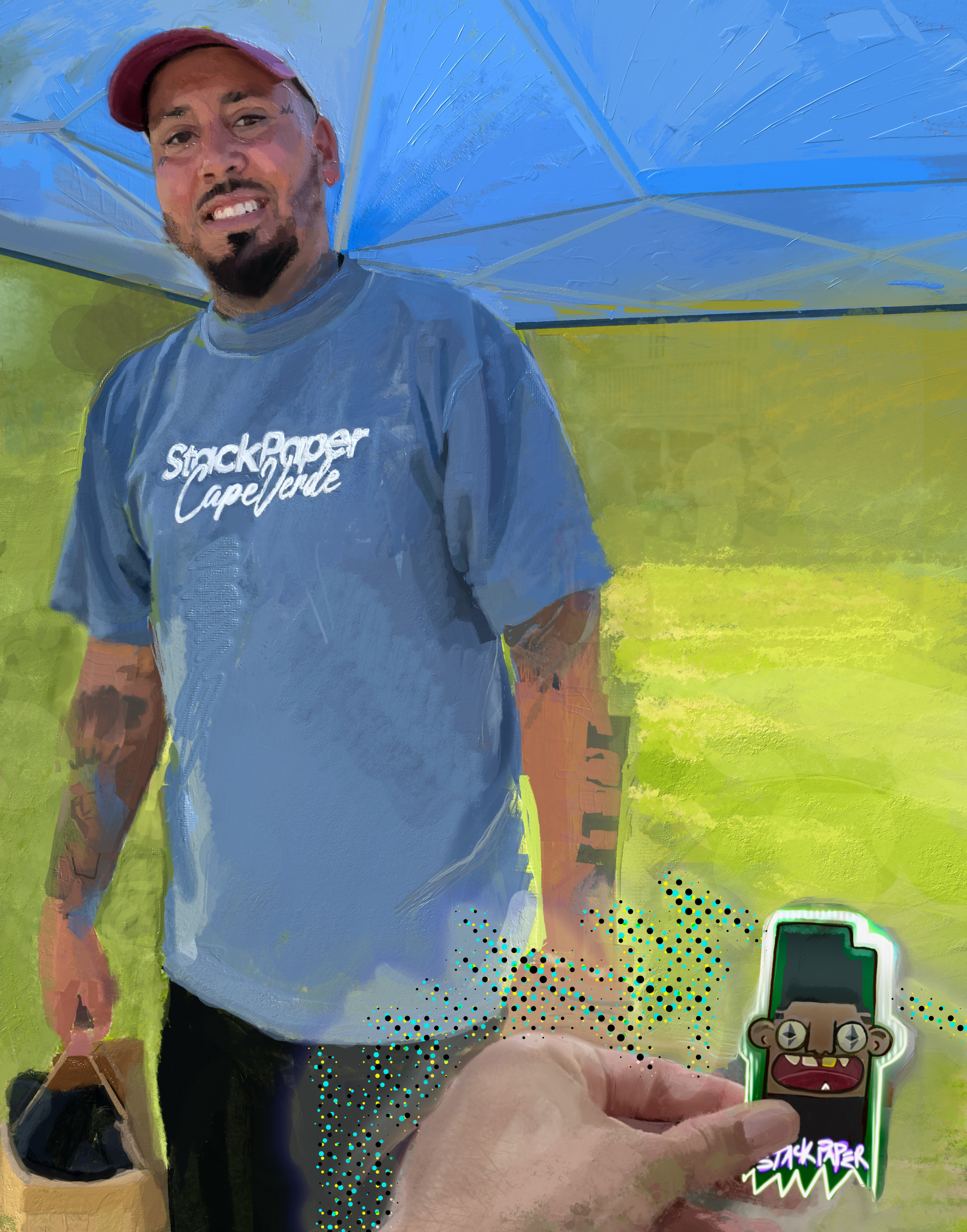 Capture the essence of StackPaper culture with this vibrant, hand-crafted digital portrait. Featuring a bold and artistic interpretation of a proud StackPaper supporter in a Cape Verde edition tee, this piece embodies the energy and creativity of the brand.